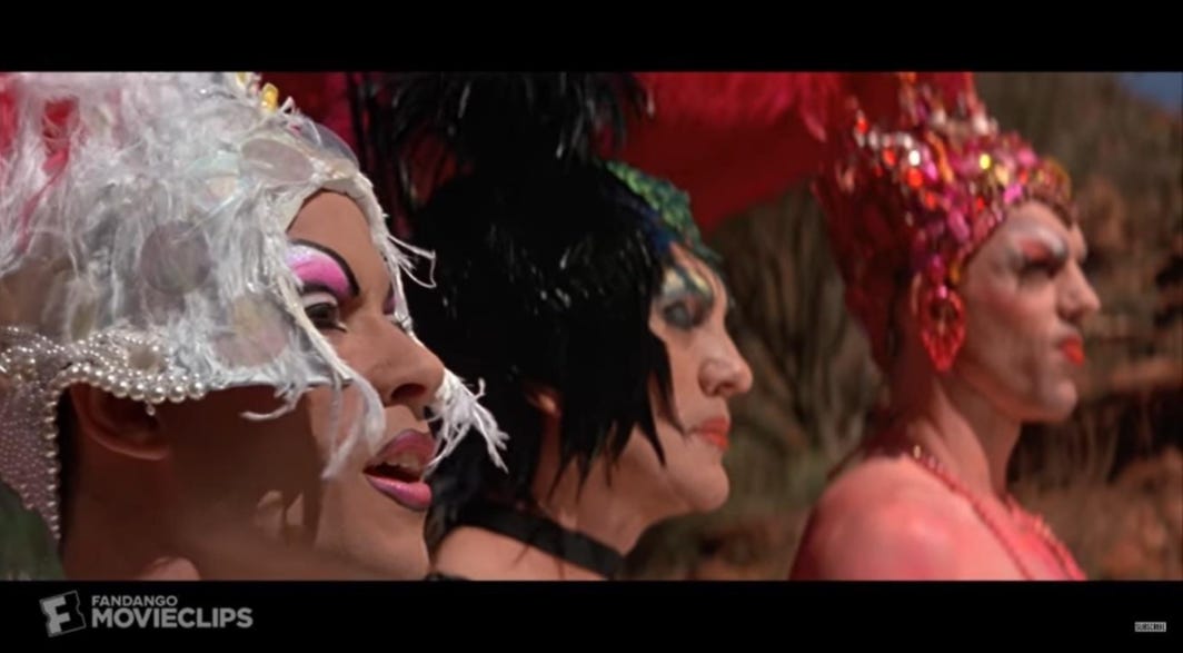 The trials of a monochrome environment are just as important as the dreams of our colourful spectacles. Completely opposite to Dorothy in The Wizard of Oz,53 where she “falls” into colour and 54then must ‘leave” colour at the end, in Priscilla, we learn that colour is everywhere and it’s the one thing that can enrich us. Whether it be dry winds lifting orange polyester into a brilliant spiral55 or a dream to climb a mountain in full drag, we must coexist with colour.
